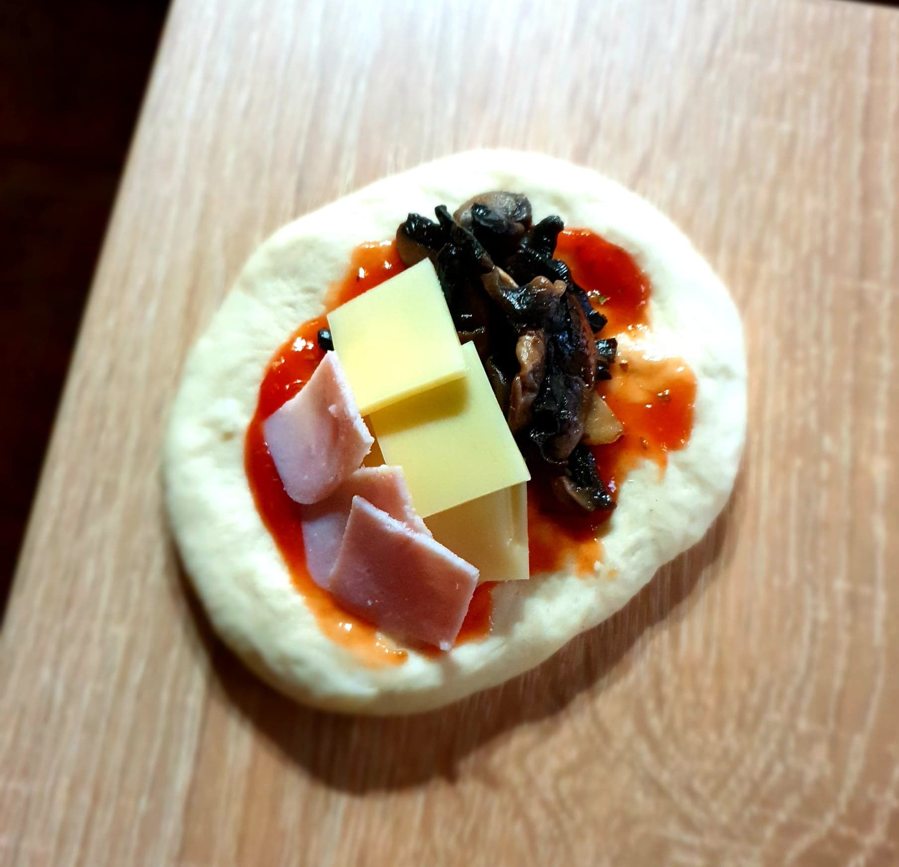 Z wyrobionego ciasta odrywamy małe porce, formujemy kulkę, a następnie rozpłaszczamy ją i smarujemy sosem ketchupowym, nakładamy porcję pieczarek, sera i szynki.