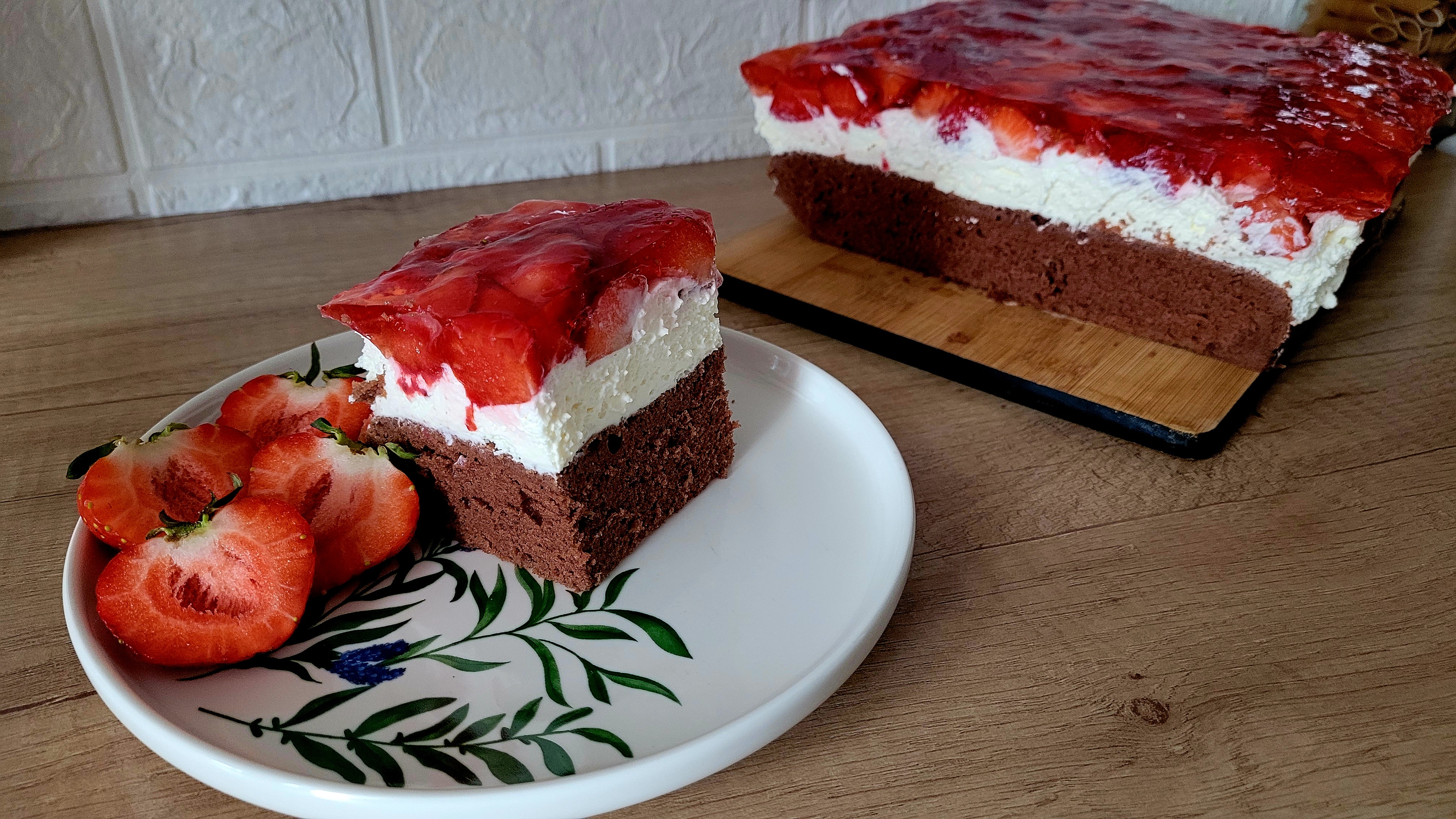5. Biszkopt: Jajka z cukrem ubijamy na szybkich obrotach miksera aż masa stanie się jasna i puszysta. Mąkę, kakao i proszek do pieczenia przesiewamy do masy jajecznej, dodajemy olej i całość delikatnie mieszamy szpatułką, sięgając dna miski, aby wszystko się ze sobą dobrze połączyło. Ciasto przelewamy do przygotowanej wcześniej blaszki i pieczemy przez ok. 20-25 min., ''do suchego patyczka''. Gotowy biszkopt wyciągamy z piekarnika i odstawiamy do wystudzenia. Przestudzony nasączamy.