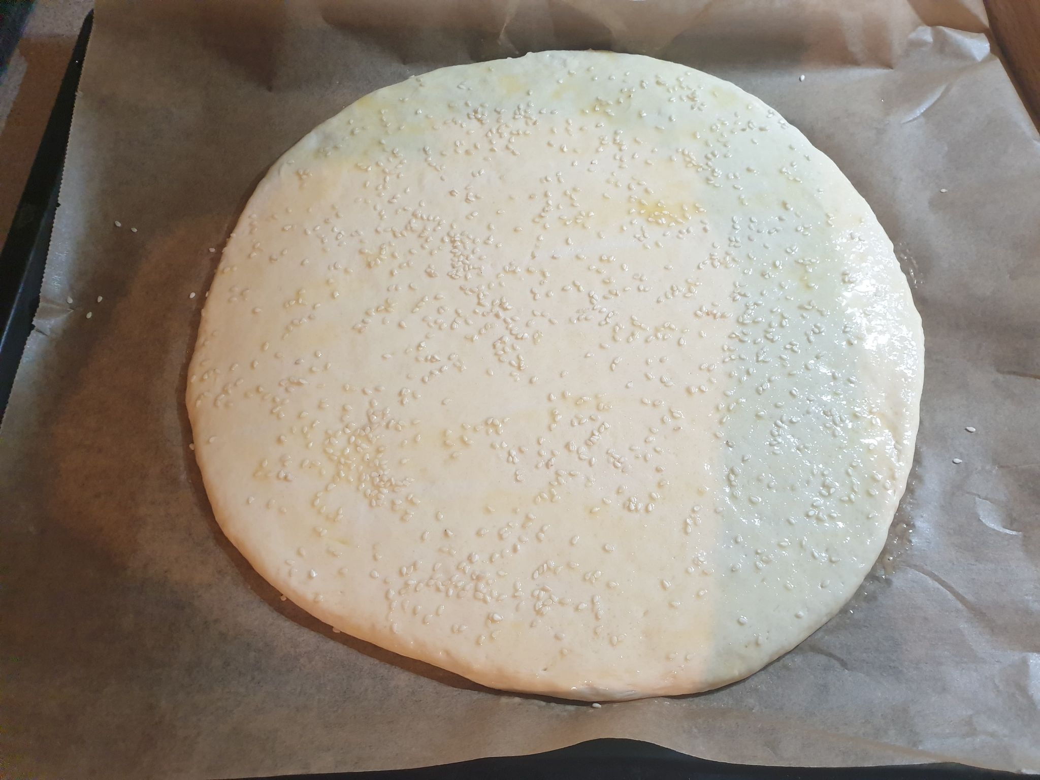 4. Po wyrośnięciu wyjmujemy ciasto na blaszkę wyłożoną papierem do pieczenia i formujemy płaskie koło o średnicy 30cm. Smarujemy je rozkłóconym jajkiem i (jeśli chcemy) posypujemy z wierzchu sezamem.