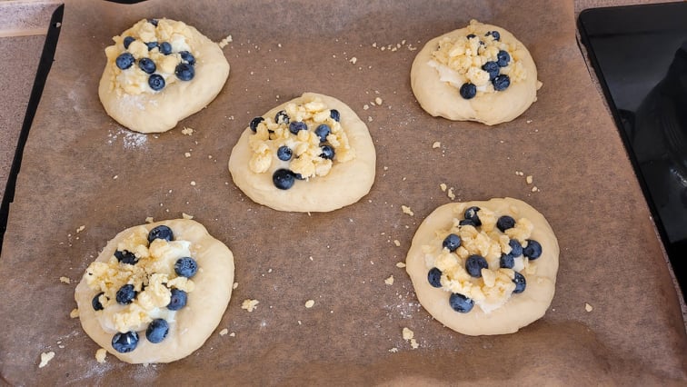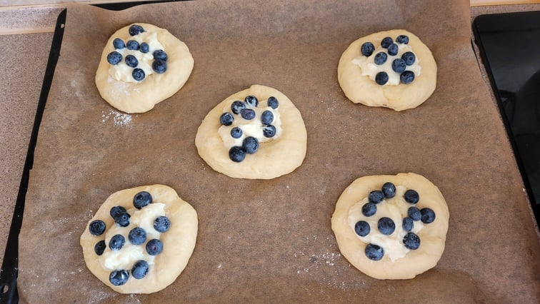 Do dużej miski wlewamy mleko i jogurt naturalny. Dodajemy drożdże i dokładnie mieszamy do rozpuszczenia. Wsypujemy mąkę i cukier. Wbijamy jajko i jedno żółtko i wyrabiamy ciasto przy użyciu robota z hakiem do ciasta drożdżowego. Wyrabiamy około 12-14 minut - jeśli ręcznie to około 15-17 minut. Pod koniec wlewamy masło i zagniatamy do uzyskania jednolitego ciasta. Odstawiamy do wyrośnięcia na minimum godzinę. Po wyrośnięciu ciasto dzielimy na 12 równych części. Każdą z nich formujemy w kulkę i układamy na blasze do pieczenia. Dnem szklanki oprószonym mąką robimy w każdej bułce zagłębienie. Nakładamy po łyżce kremu. Posypujemy borówkami i kruszonką. W miseczce mieszamy żółtko z mlekiem i smarujemy ciasto (dzięki temu drożdżówki będą się błyszczały) Drożdżówki nakrywamy ściereczką i odstawiamy do wyrośnięcia na 15-20 minut. Pieczemy w piekarniku nagrzanym do 180 stopni przez 20-25 minut.