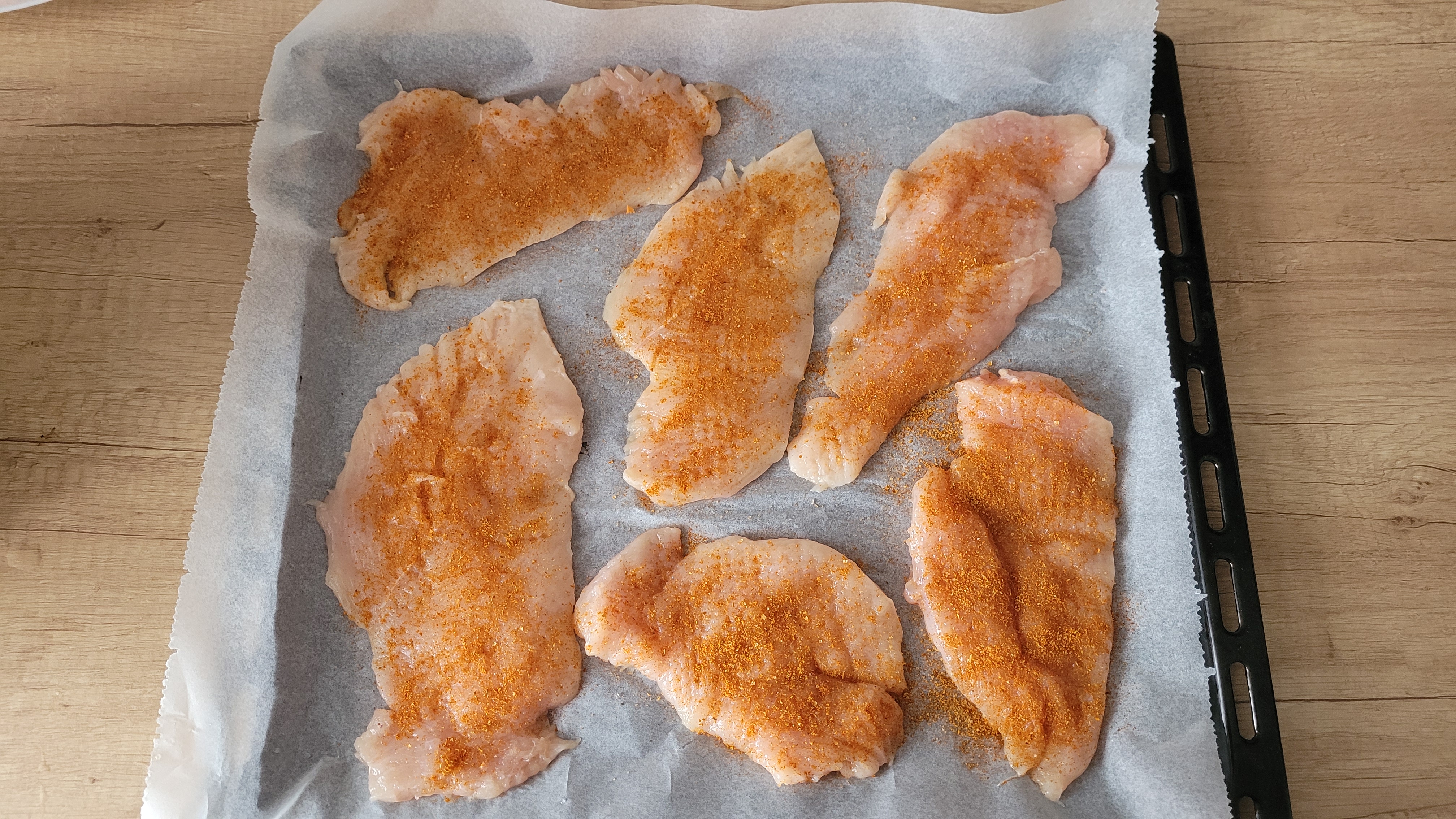 1. Piersi z kurczaka myjemy, osuszamy i pozbywamy się błonek. Następnie przekrawamy je na pół i lekko rozbijamy