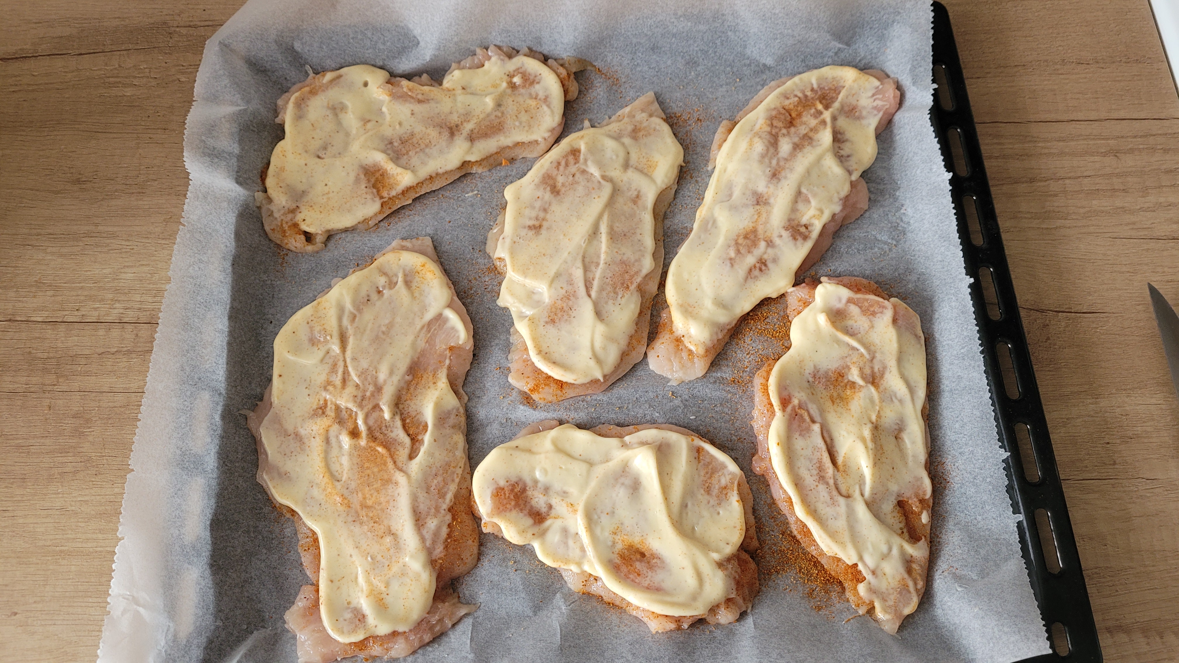 3. Każdy z kotletów posypujemy przyprawą do kurczaka i smarujemy łyżką majonezu