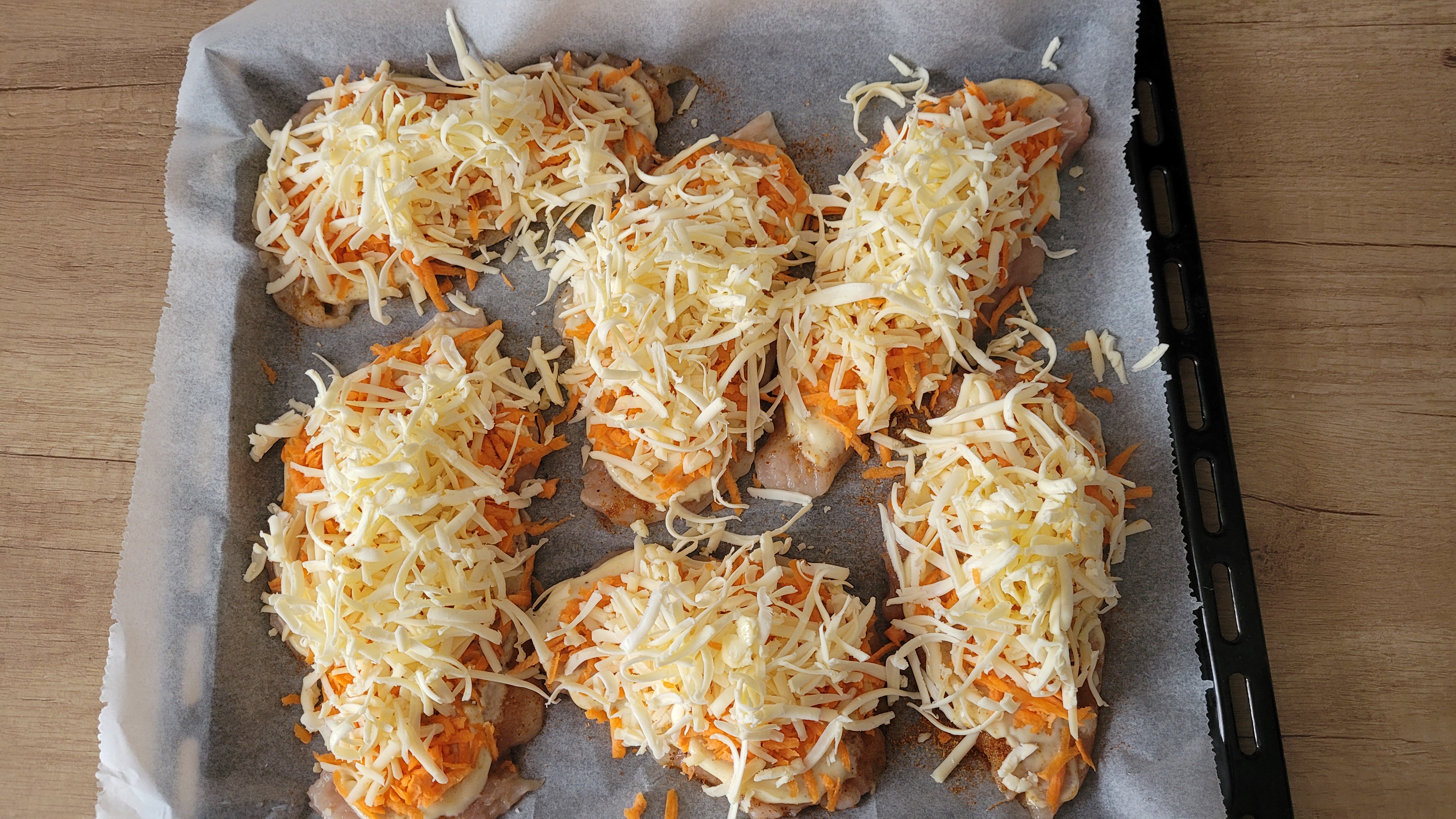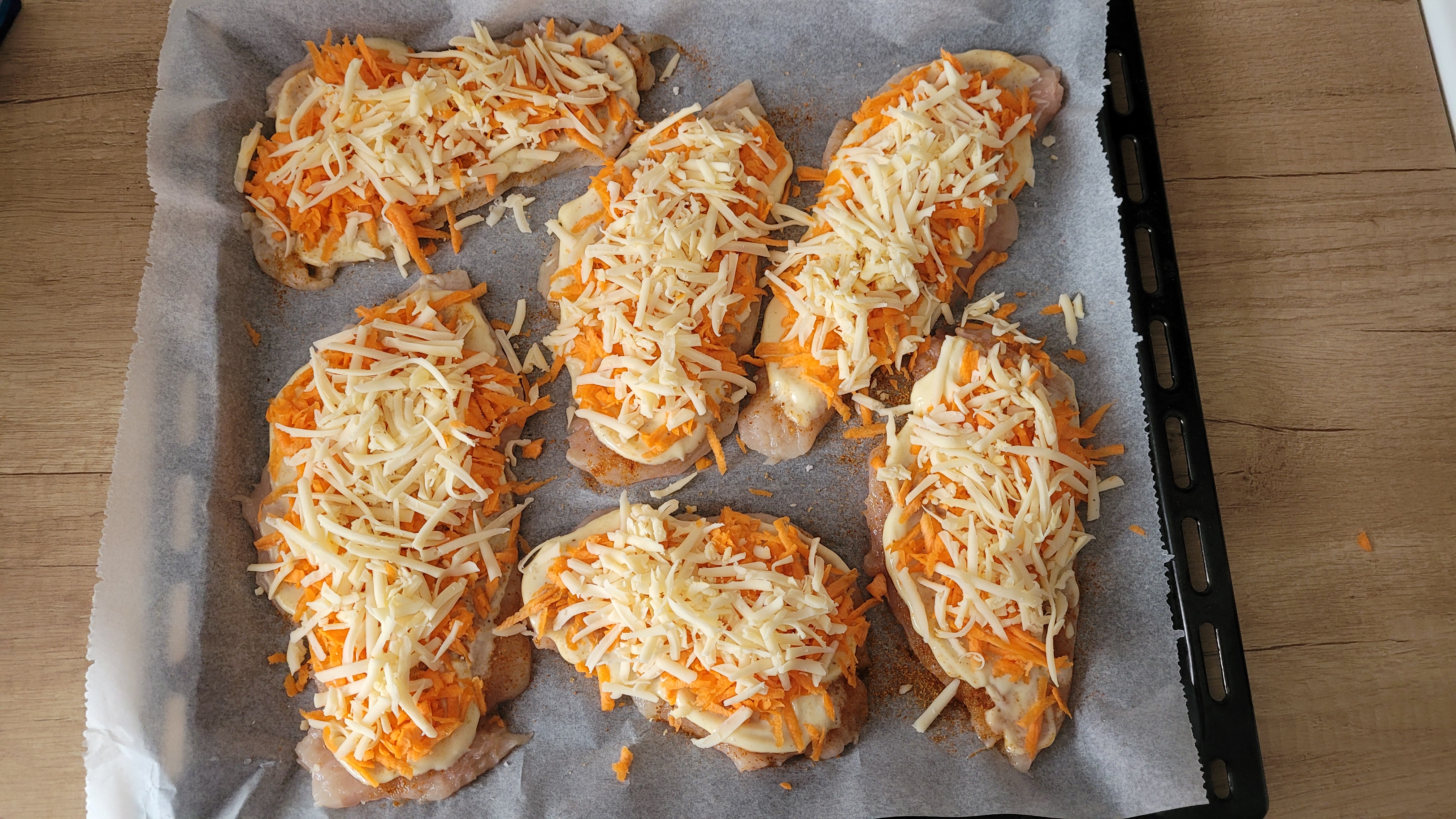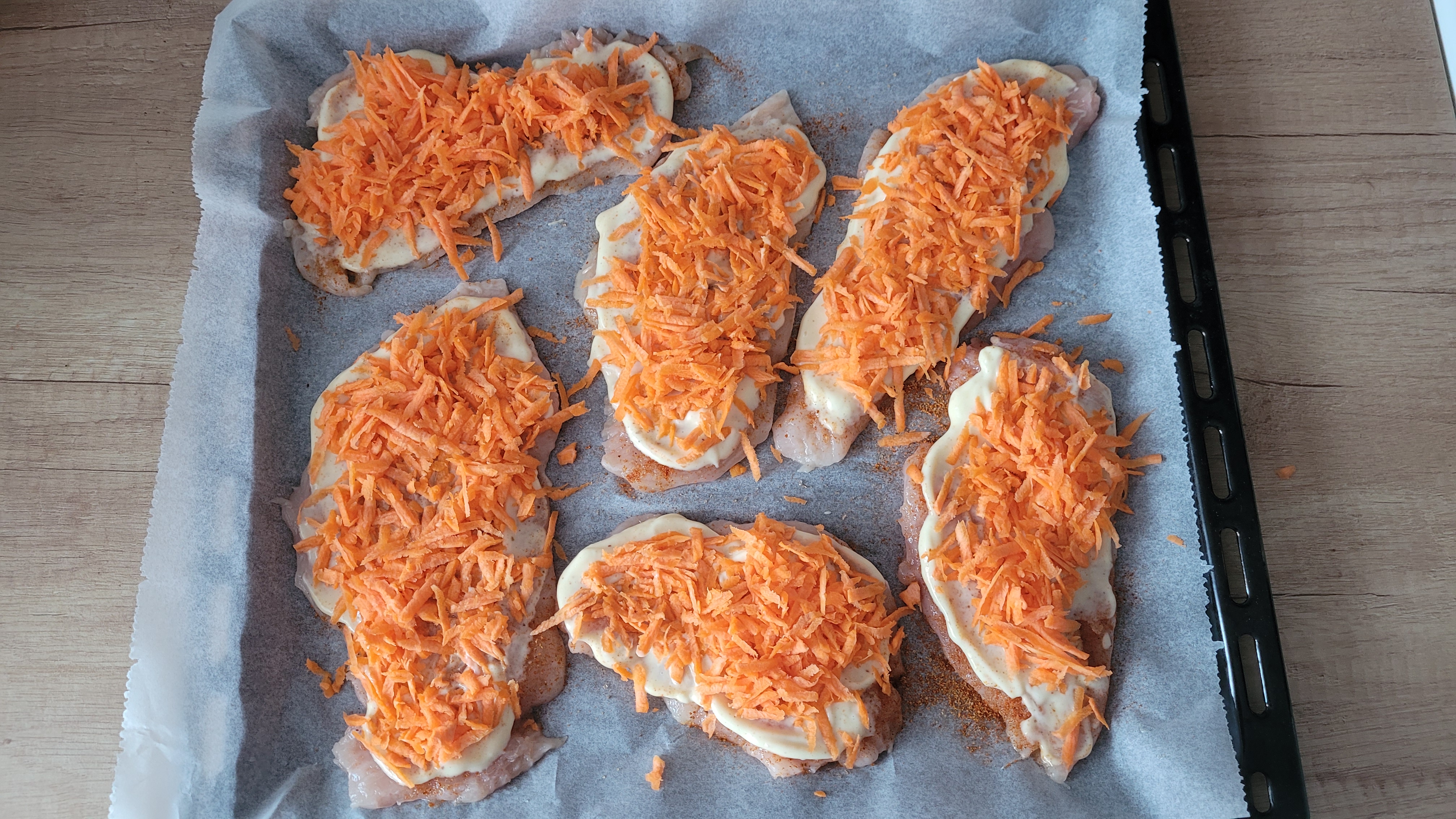 5. Na mięsie układamy warstwę marchewki, a następnie sera.