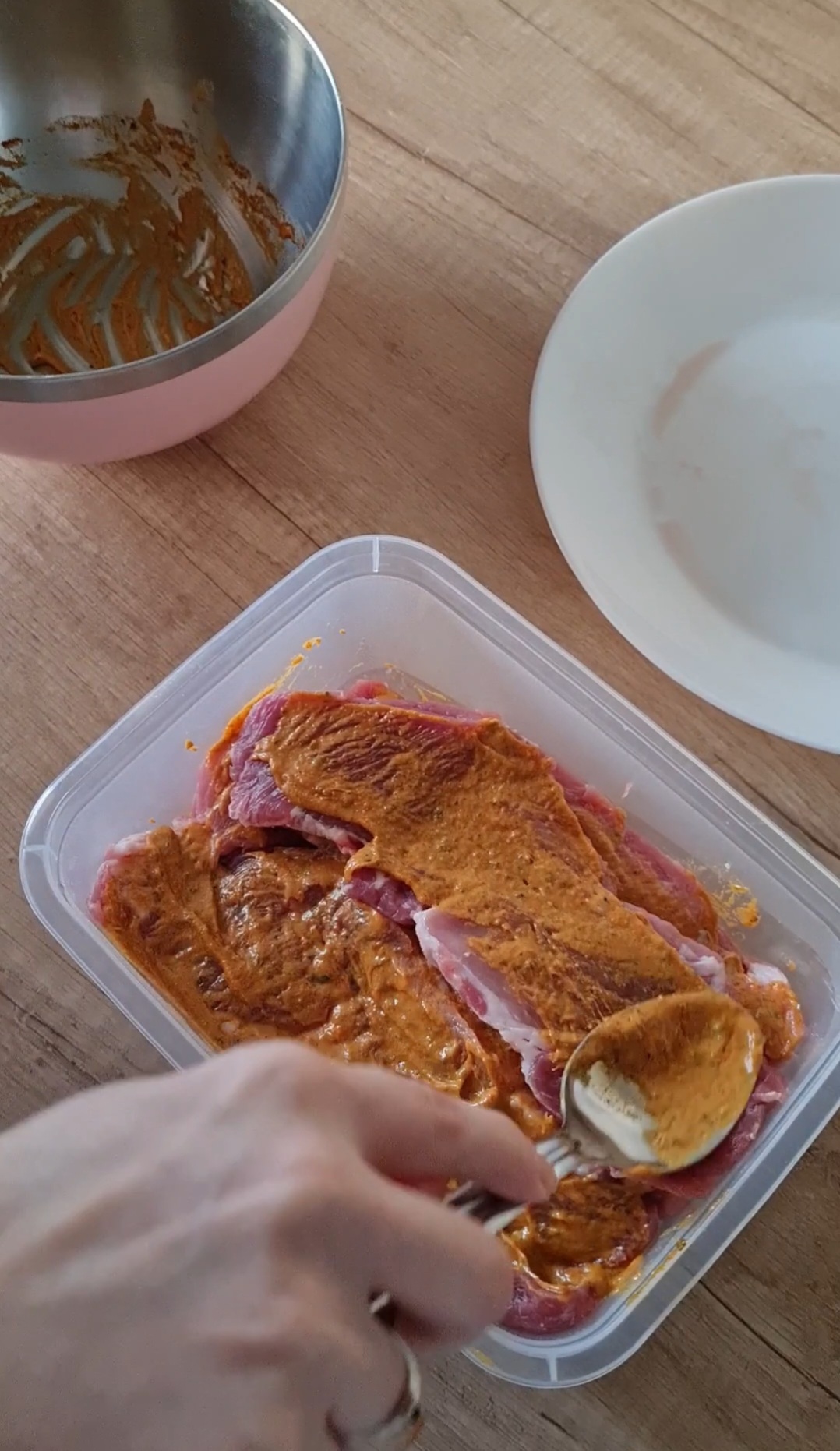 1. Marynata: w miseczce umieszczamy wszystkie składniki marynaty i dokładnie mieszamy do uzyskania jednolitej konsystencji.