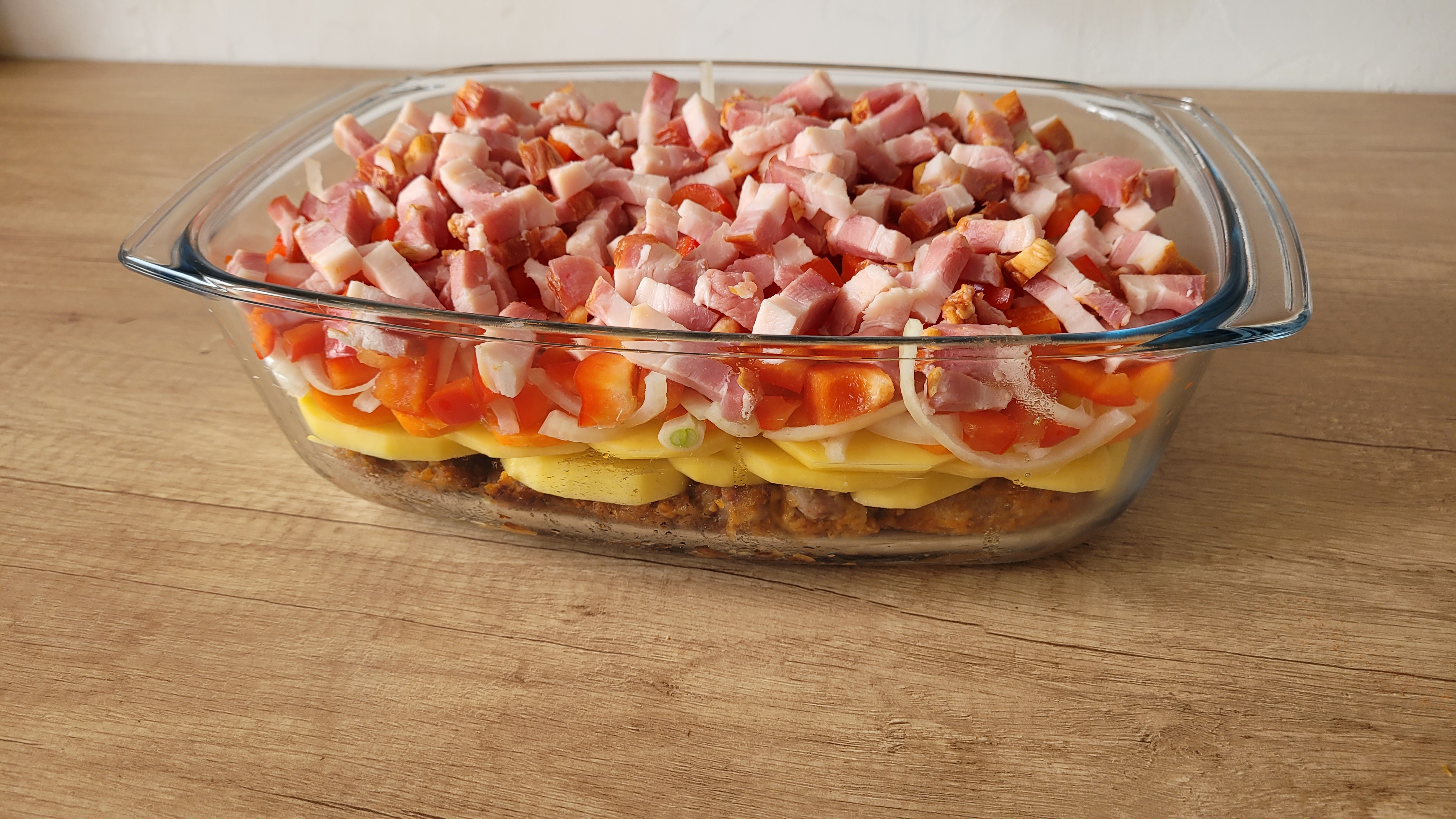 6. Na wierzch kładziemy ziemniaki, marchewkę, paprykę, cebulę i boczek. Wlewamy wodę.
