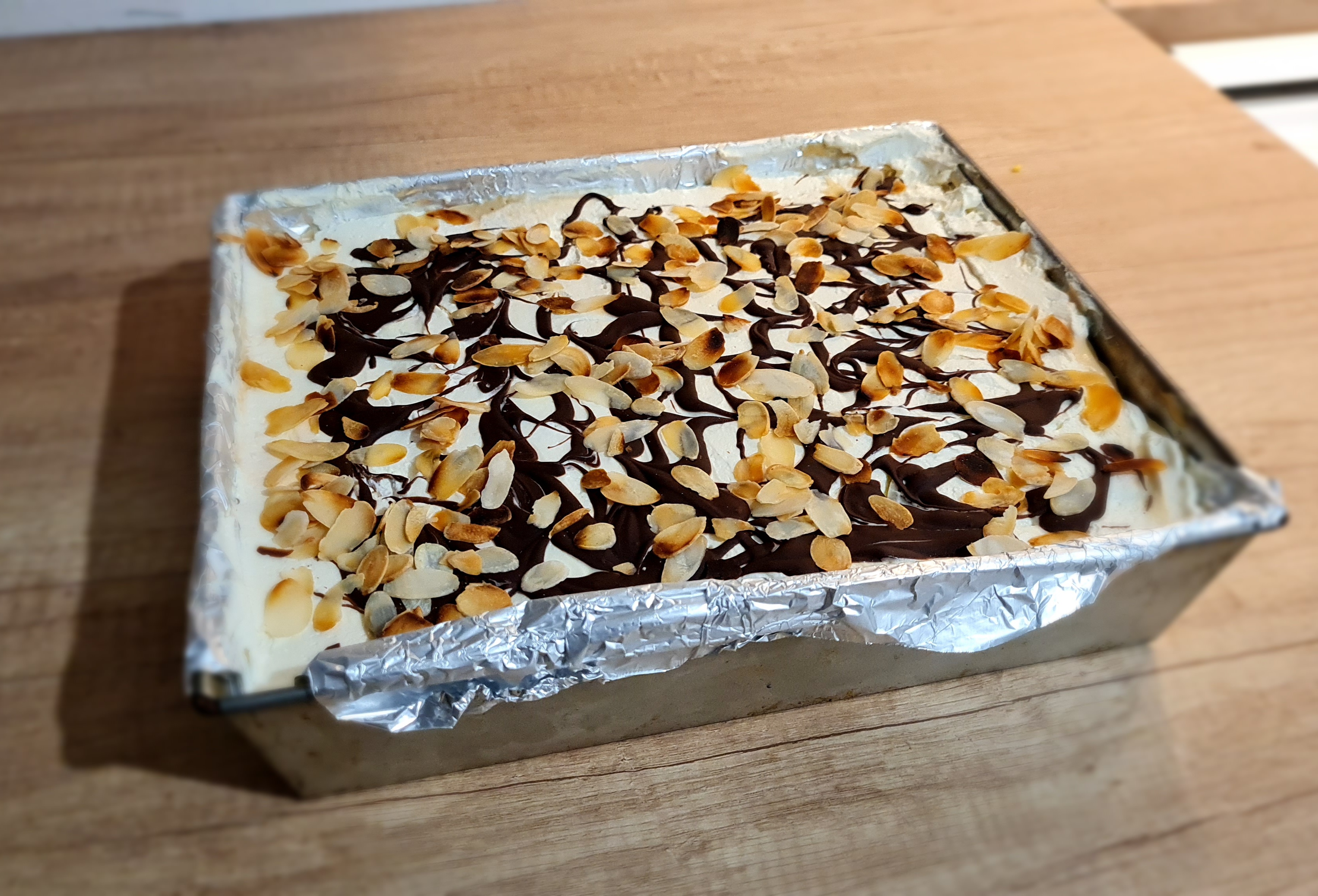 8. Wyciągamy ciasto z lodówki i polewamy je czekoladą oraz posypujemy płatkami migdałowymi.