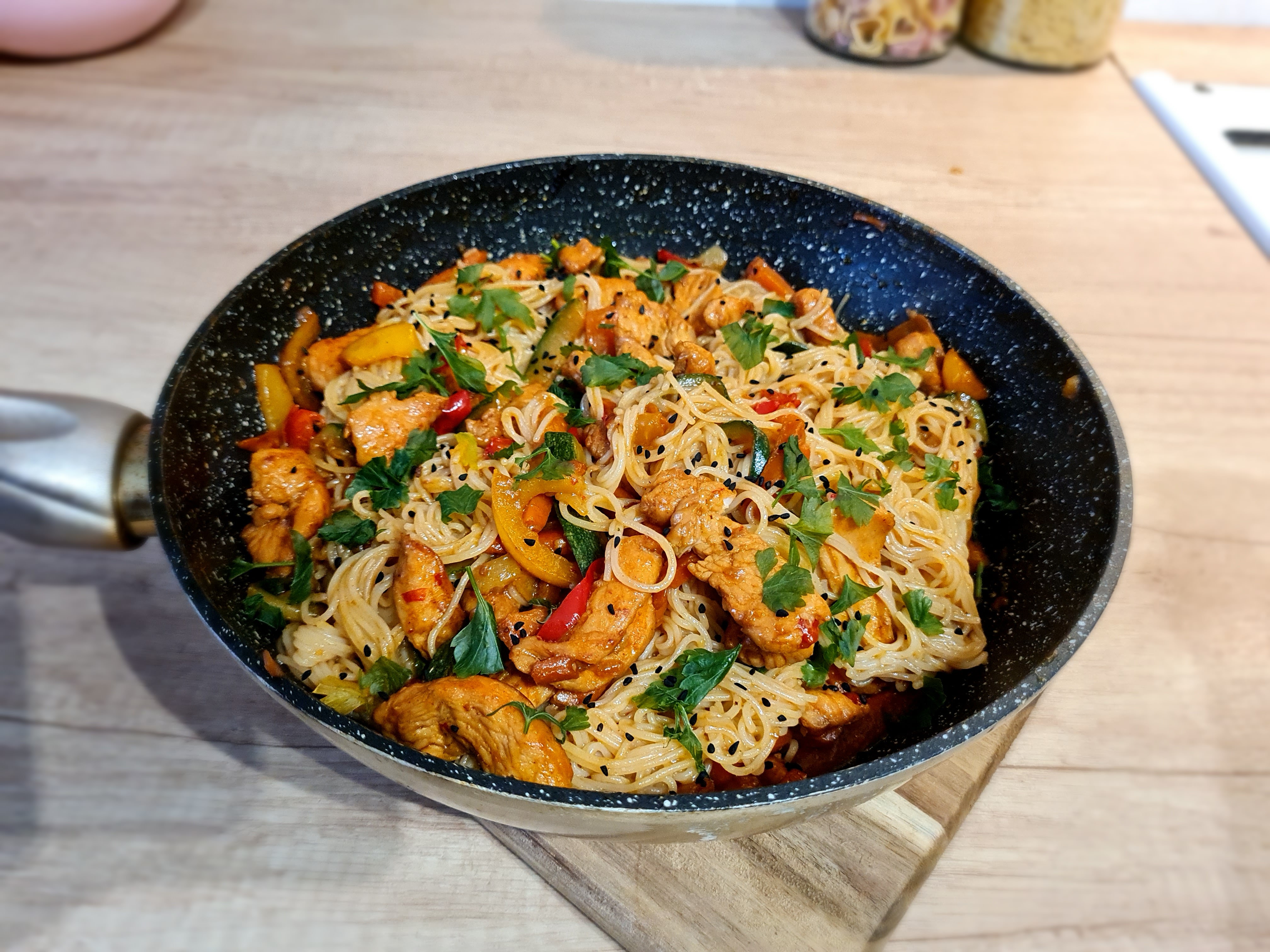 5. Makaron ryżowy gotujemy w osolonym wrzątku według przepisu na opakowaniu. Gotowy odcedzamy i przekładamy do podduszonej zawartości patelni. Dolewamy sos i dokładnie mieszamy.