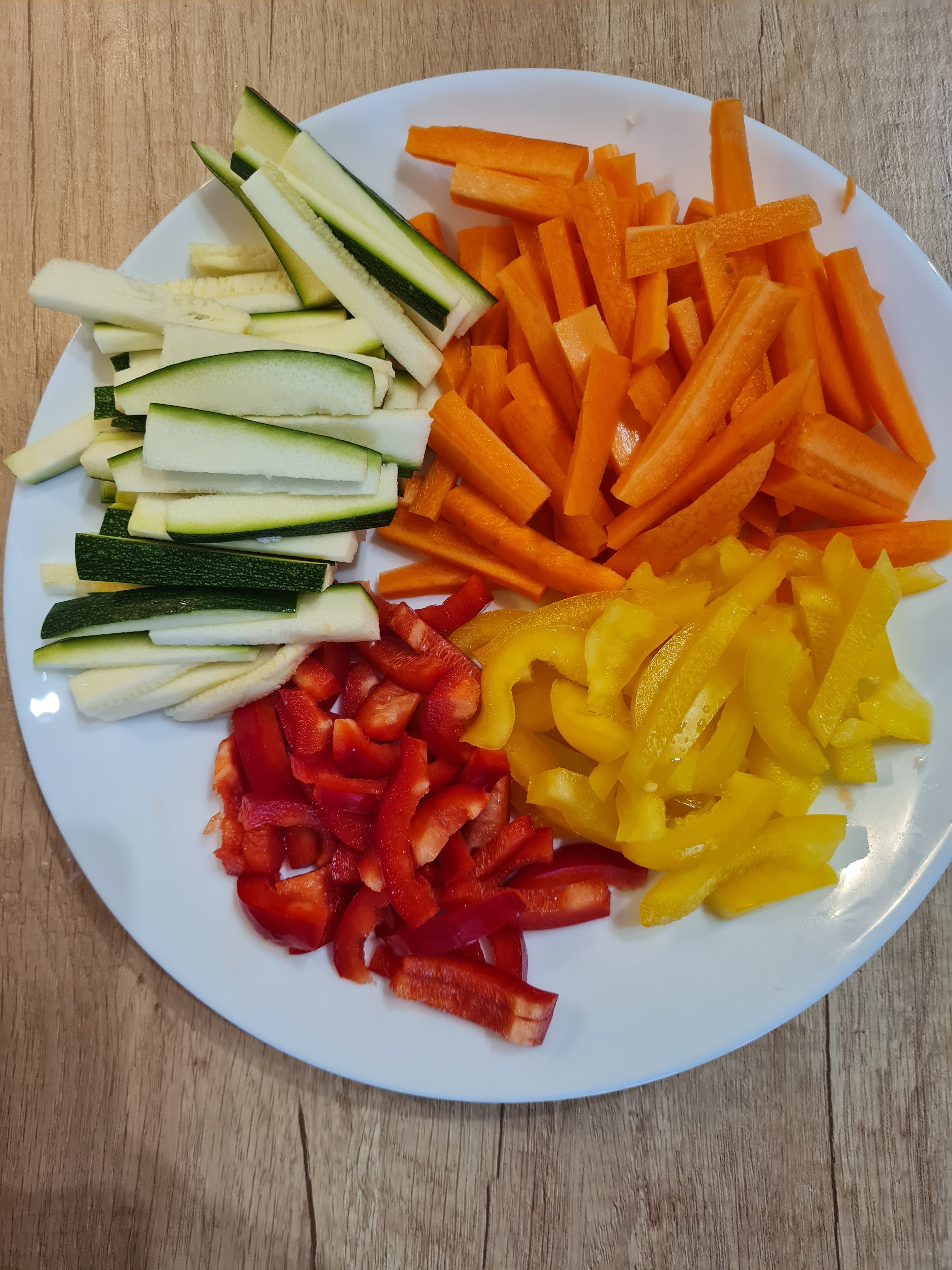 2. Marchewkę, cukinię i paprykę kroimy w paski, cebulę w drobną kostkę