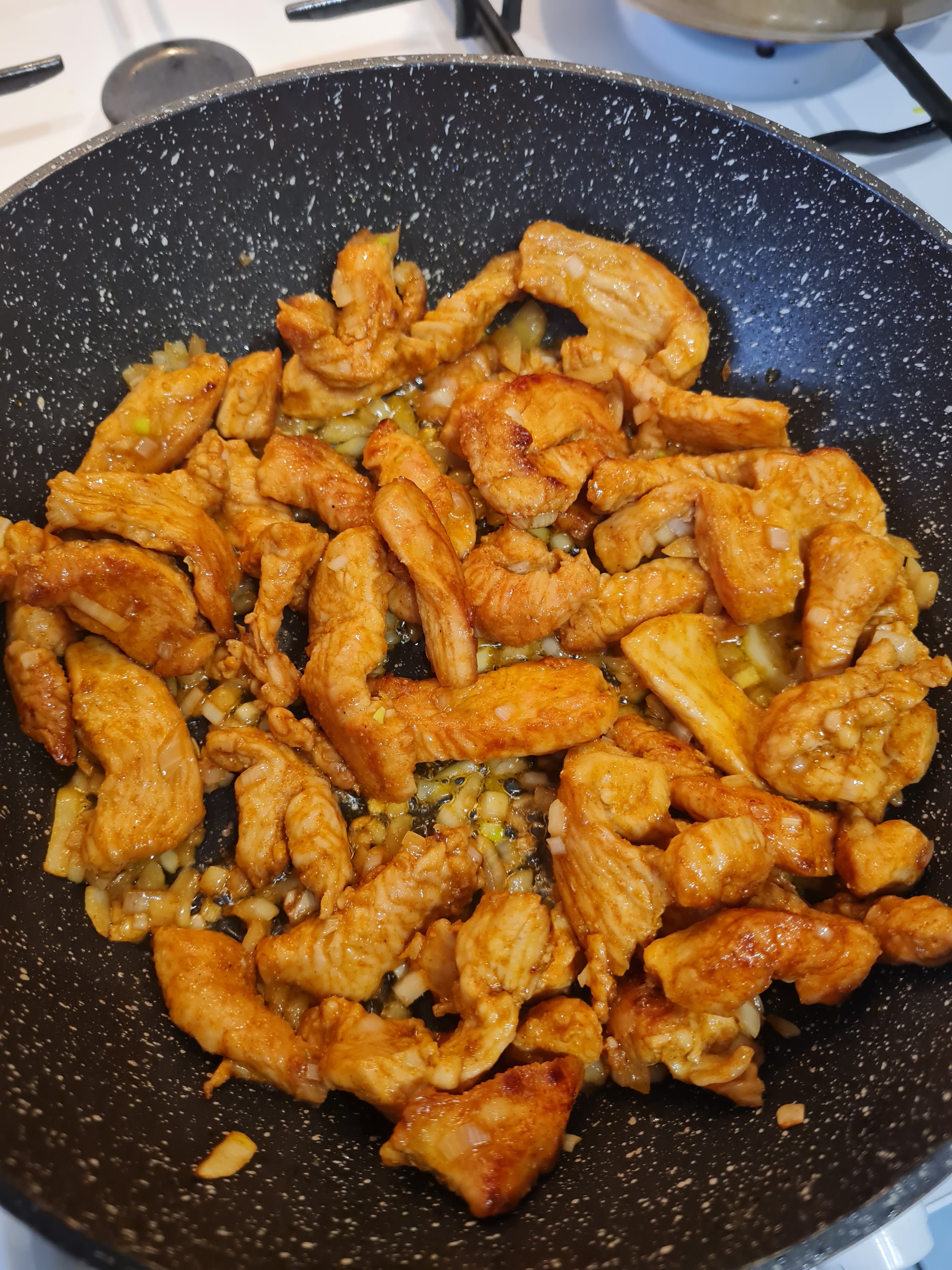 3. Na rozgrzanym oleju smażymy indyka aż będzie lekko zrumieniony, dodajemy cebulę i przeciśnięty przez praskę czosnek. Podsmażamy aż cebula się zeszkli.