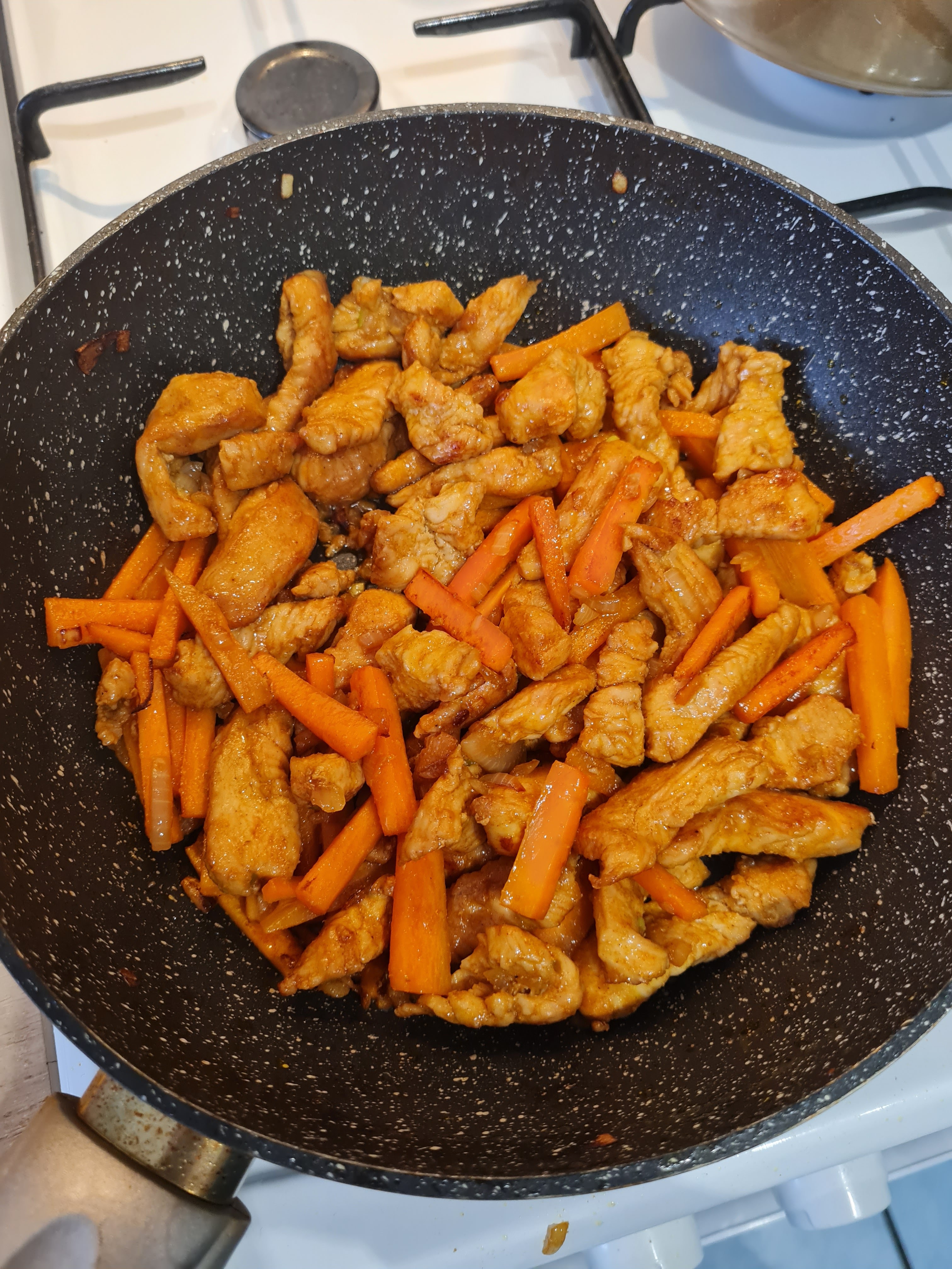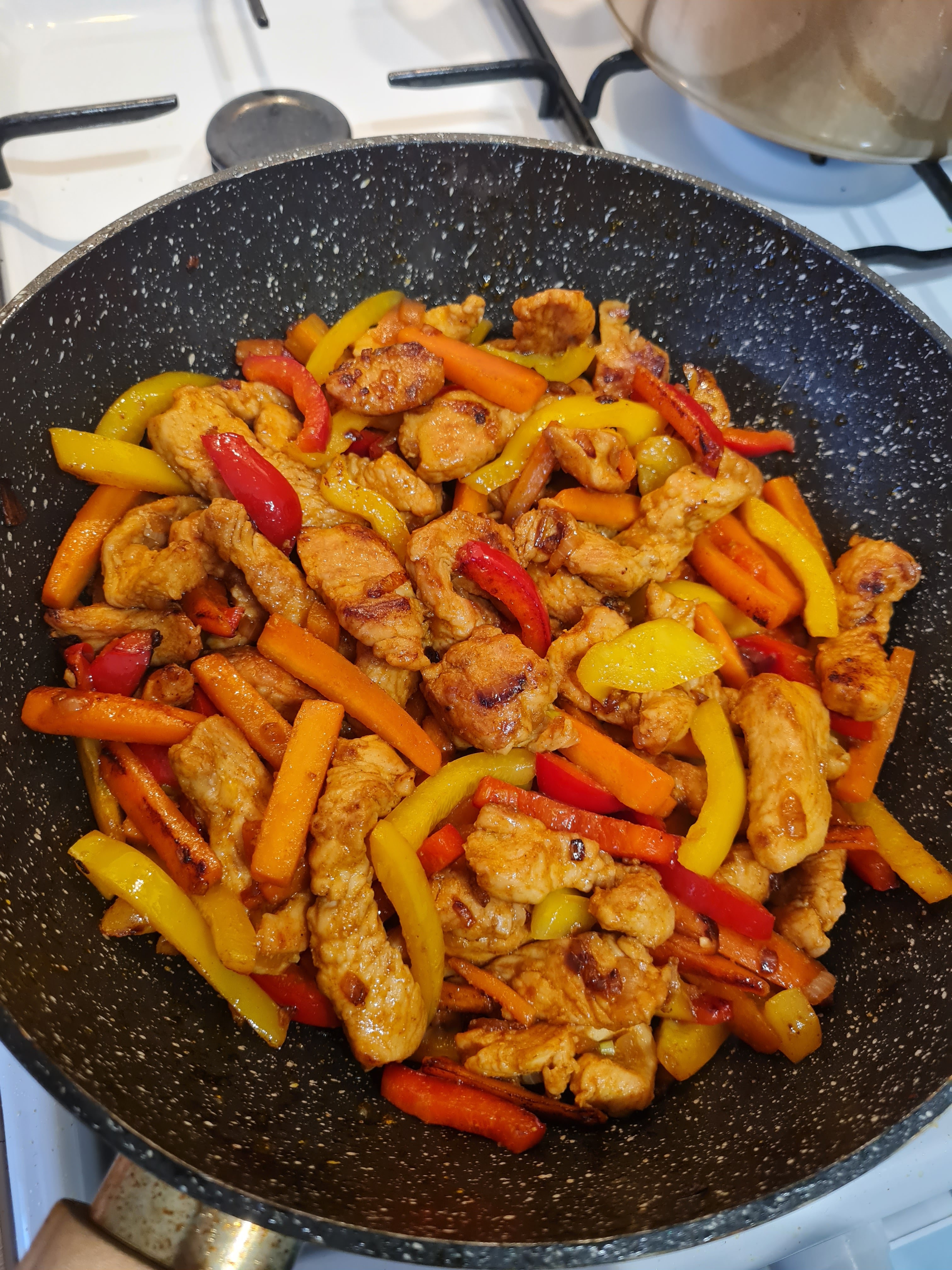 Po tym czasie wlewamy do warzyw z kurczakiem wodę i przykrywamy pokrywką. Dusimy pod przykryciem przez 7-8 minut aż wszystkie warzywa będą miękkie.