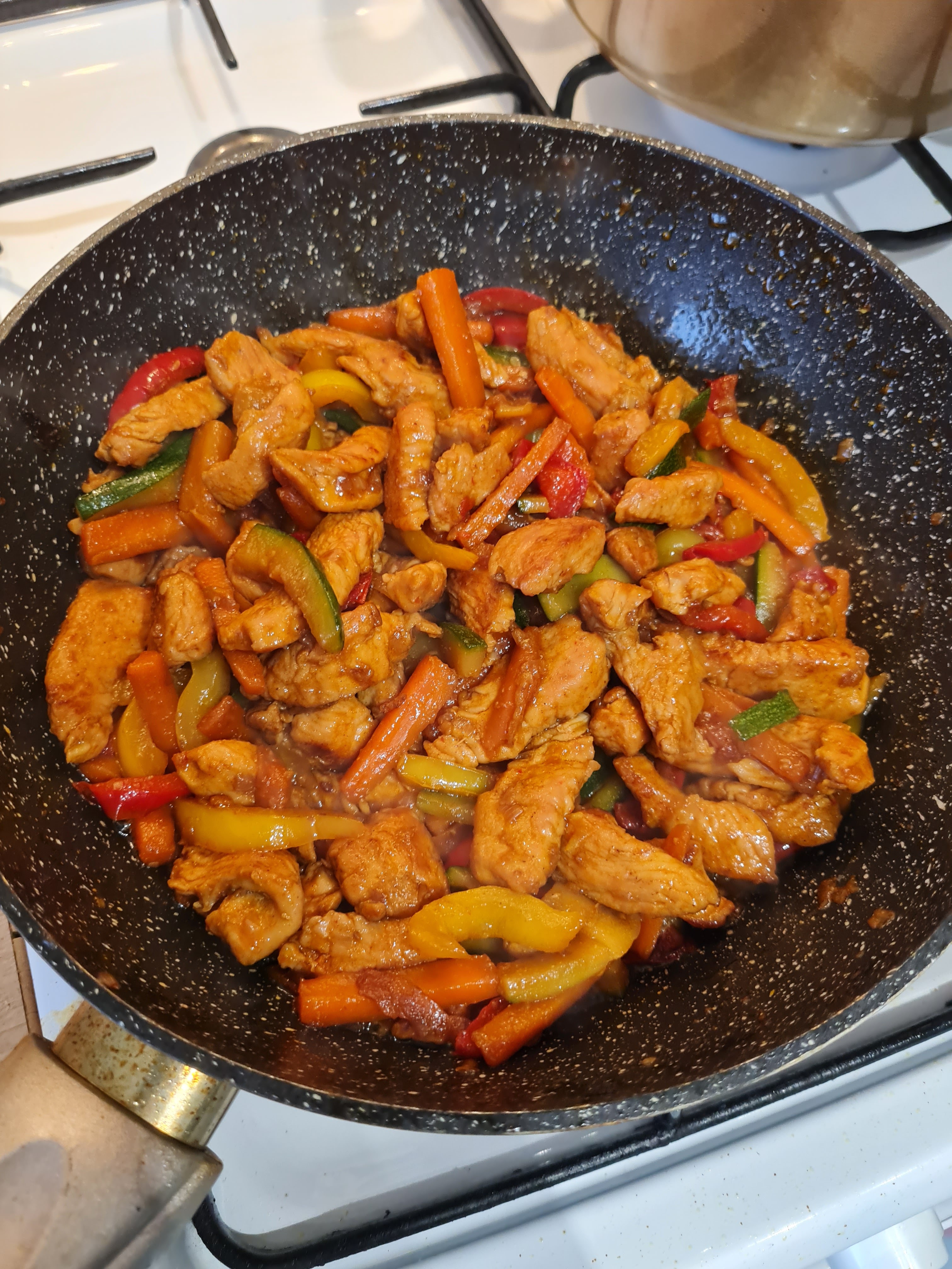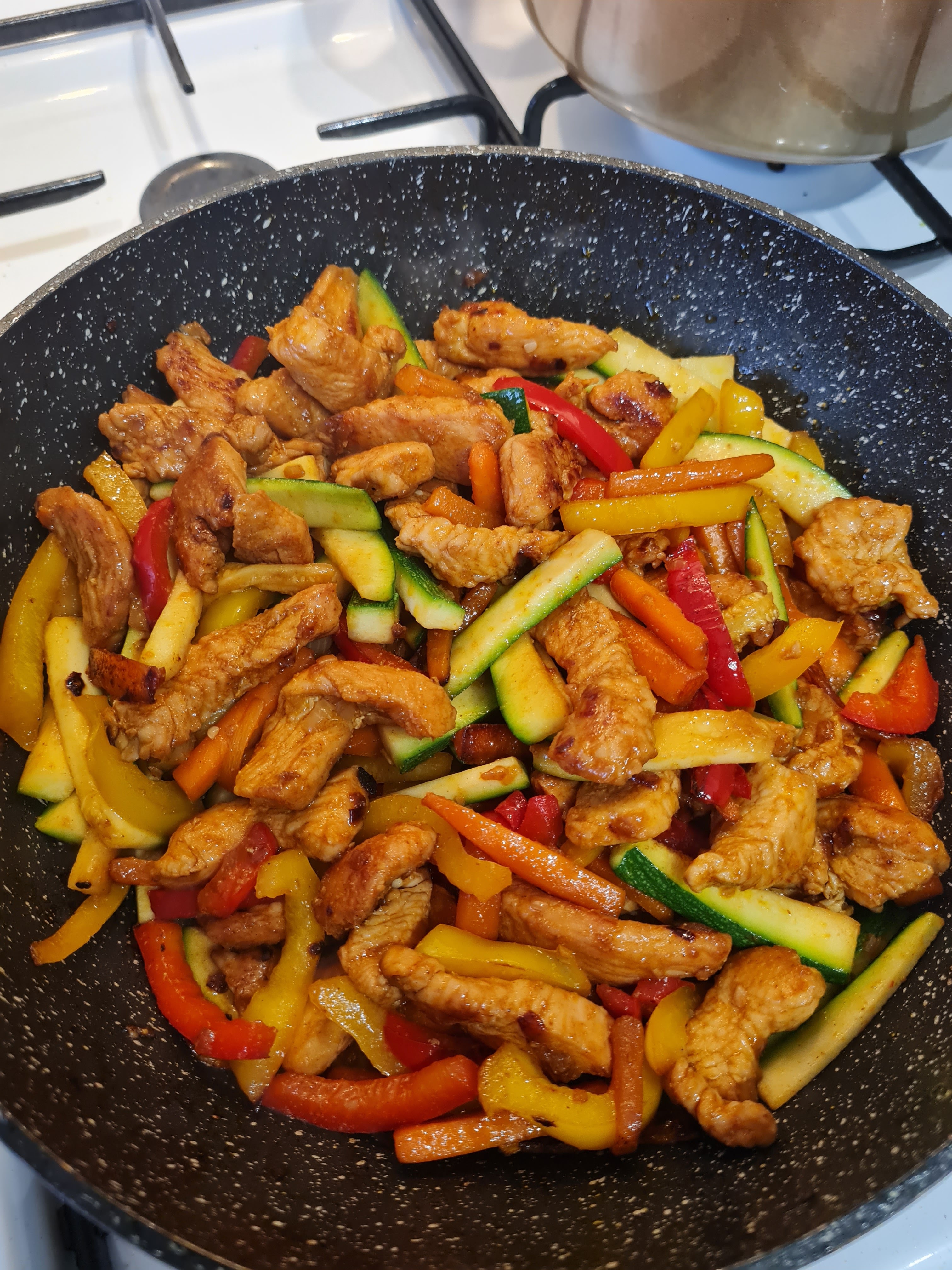 Na patelnie dorzucamy marchewkę i podsmażamy przez 5 minut, dodajemy paprykę i znów podsmażamy, na koniec cukinia i również smażymy całość przez kolejne 5 minut.