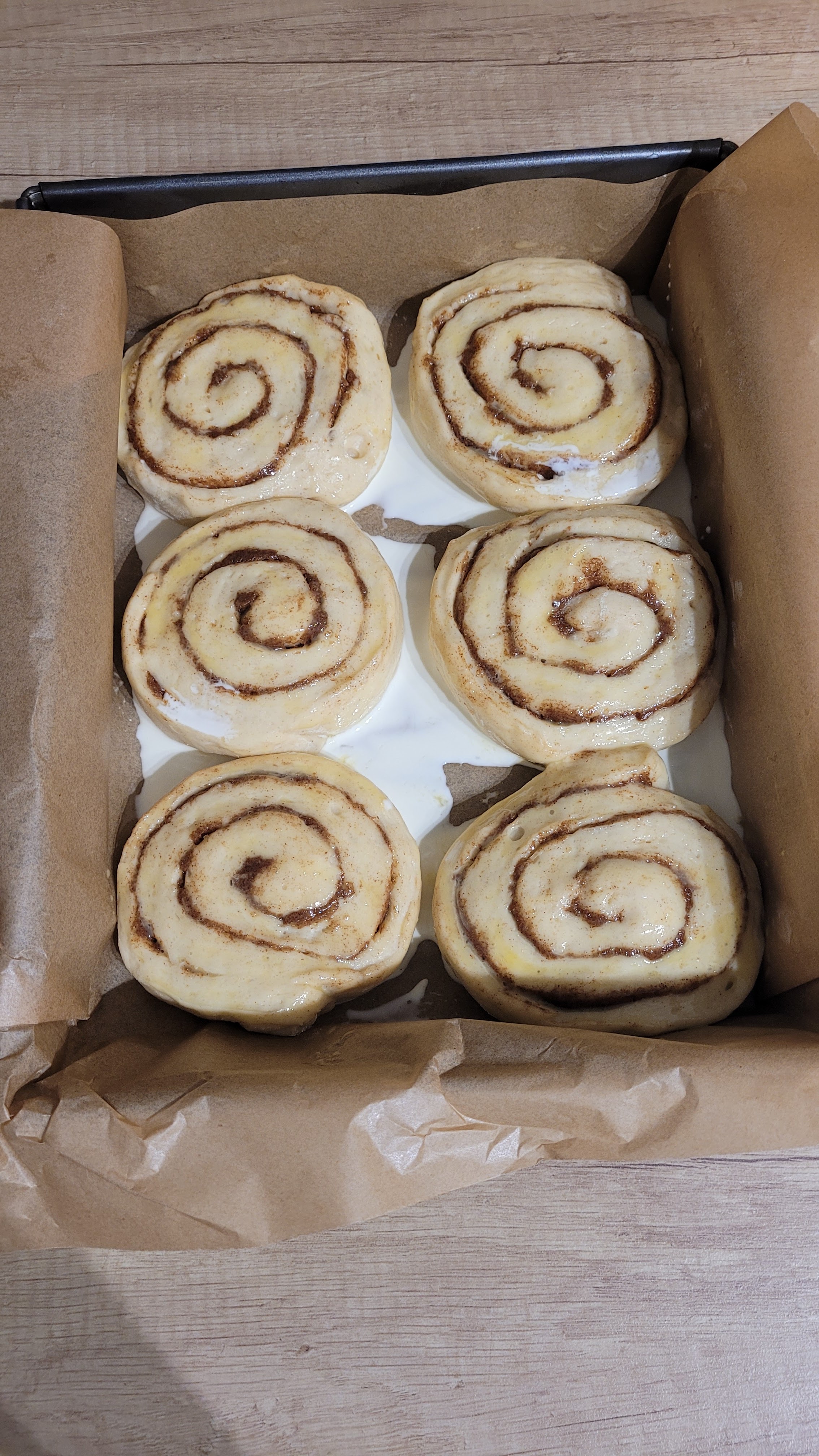 9. Wyrośnięte bułeczki smarujemy rozkłóconym jajkiem, a w wolne przestrzenie między nimi wlewamy śmietankę.