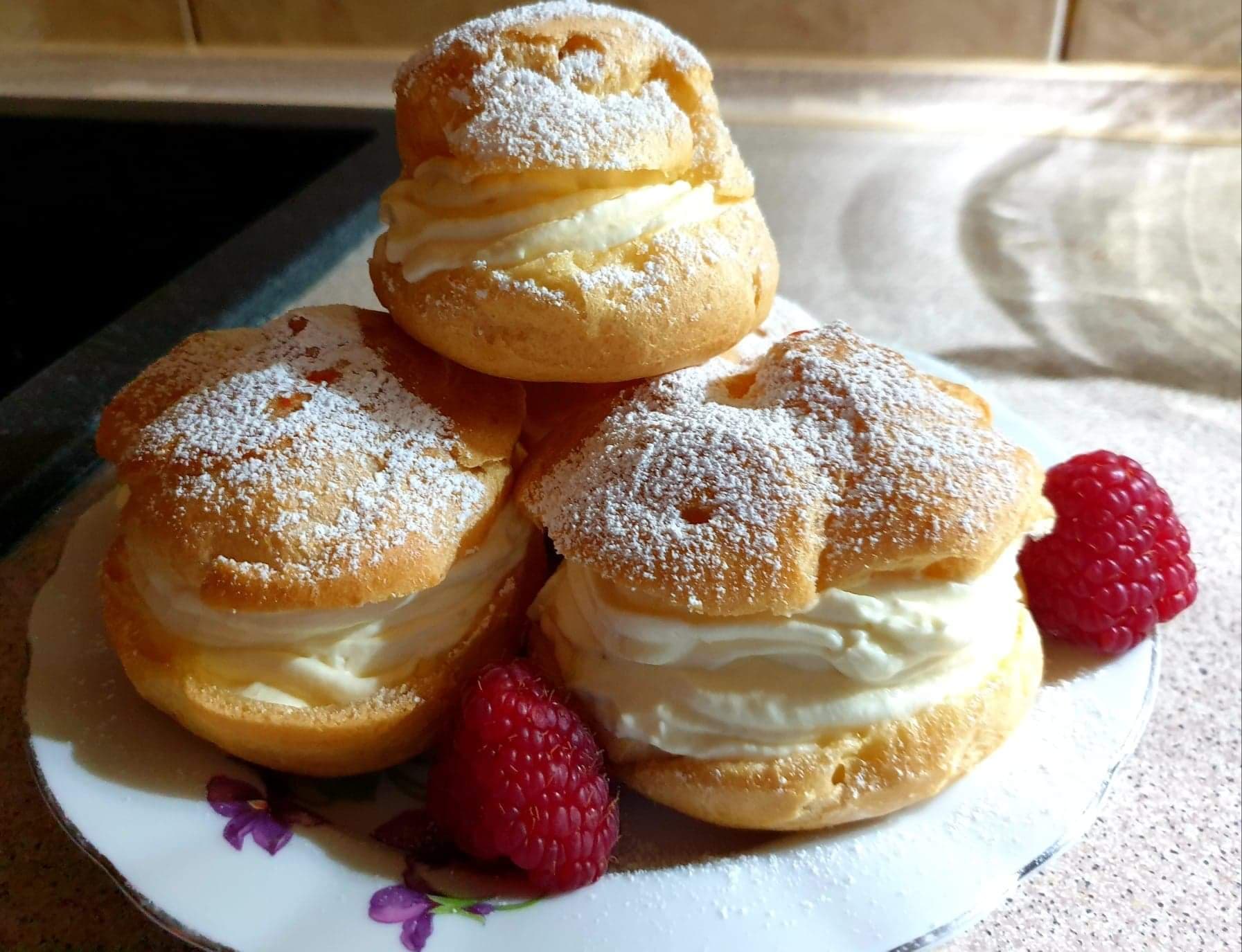Wystudzone ptysie przekrawamy w poziomie na pół. Na dolną część nakładamy krem za pomocą łyżki lub rękawa cukierniczego po czym przykrywamy wierzchnią warstwą.