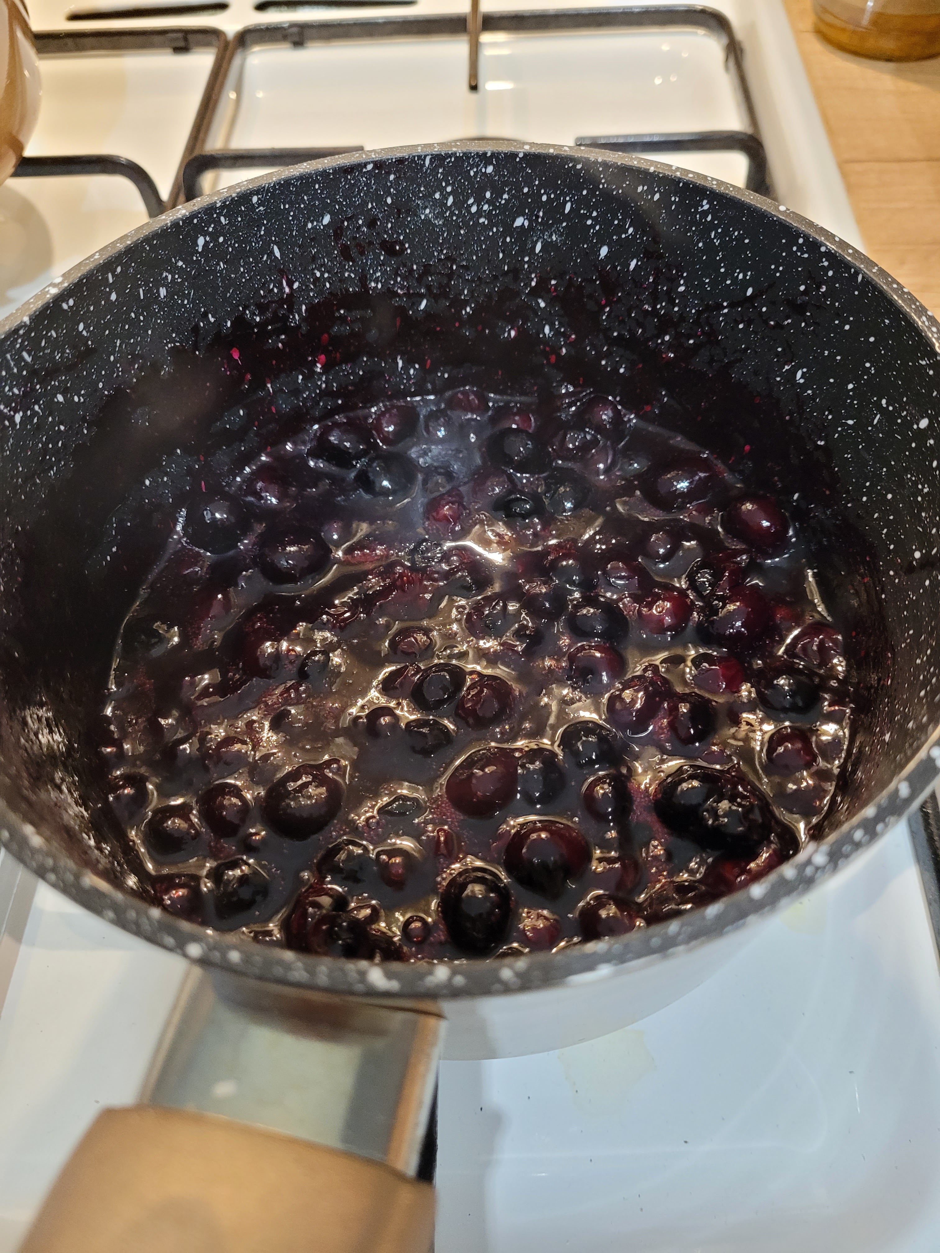 2. W zimnej wodzie rozpuszczamy mąkę ziemniaczaną i przelewamy ją do borówek. Całość mieszamy dość energicznie, aby nie powstały grudki. Frużelinę gotujemy jeszcze przez ok. minutę. Gotowa frużelina powinna mieć konsystencję, jak kisiel. Następnie wyłączamy ogień i odstawiamy ją do całkowitego wystudzenia.
