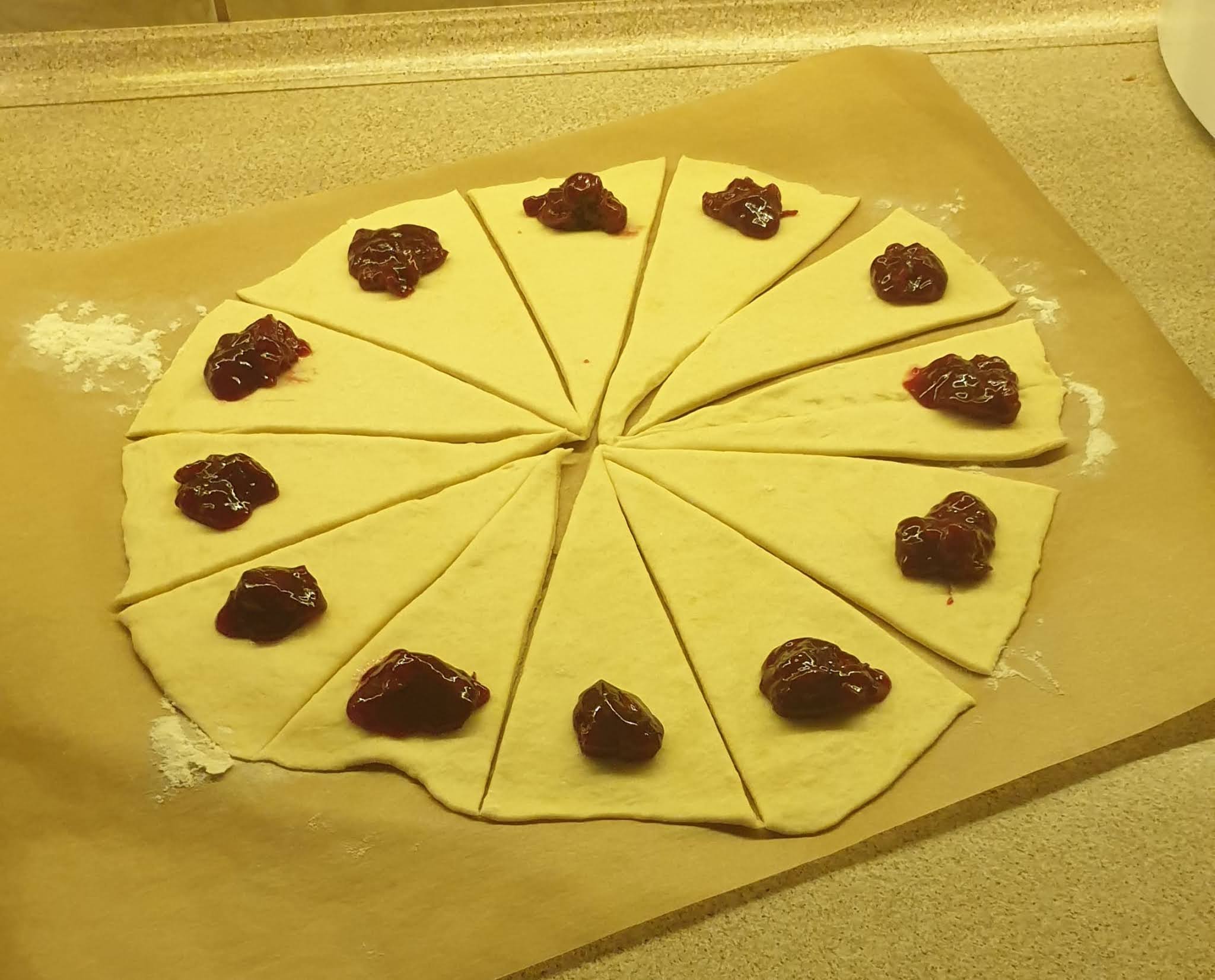 4. Schłodzone ciasto dzielimy na 3 równe części. I rozwałkowujemy je na równe koła o grubości mniej więcej 3mm. Wszystkie koła dzielimy na 12 trójkątów. Na brzegu każdego z trójkątów umieszczamy konfiturę
