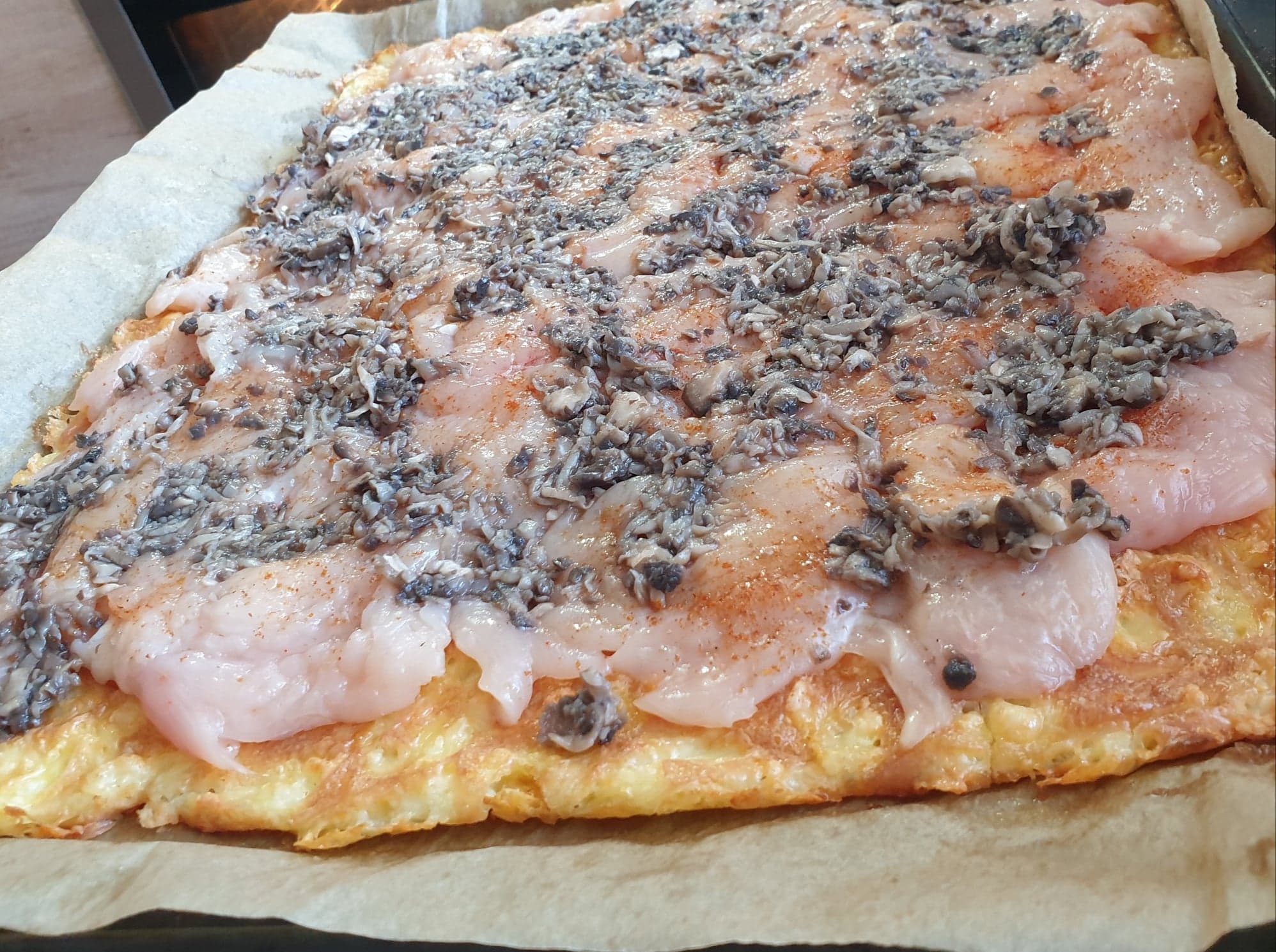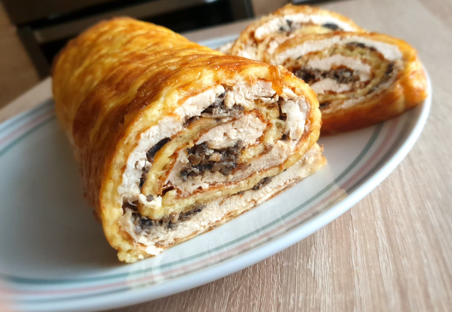 Pieczarki obieramy ze skórki i ścieramy na tarce o grubych oczkach. Smażymy je na łyżce oleju do momentu aż odparuje z nich cała woda. Na koniec smażenia dodajemy szczyptę soli i mieszamy całość. Kiedy warstwa serowa będzie upieczona, wyjmujemy ją z piekarnika i studzimy. W międzyczasie piersi z kurczaka kroimy w plastry i cienko rozbijamy. Na przestudzonym serze układamy plastry kurczaka, oprószamy je solą, przyprawą do kurczaka i papryką słodką. Wykładamy warstwę pieczarek i zawijamy roladę wzdłuż dłuższego boku. Ponownie umieszczamy ją w piekarniku i pieczemy w 180 stopniach przez około 30 minut.