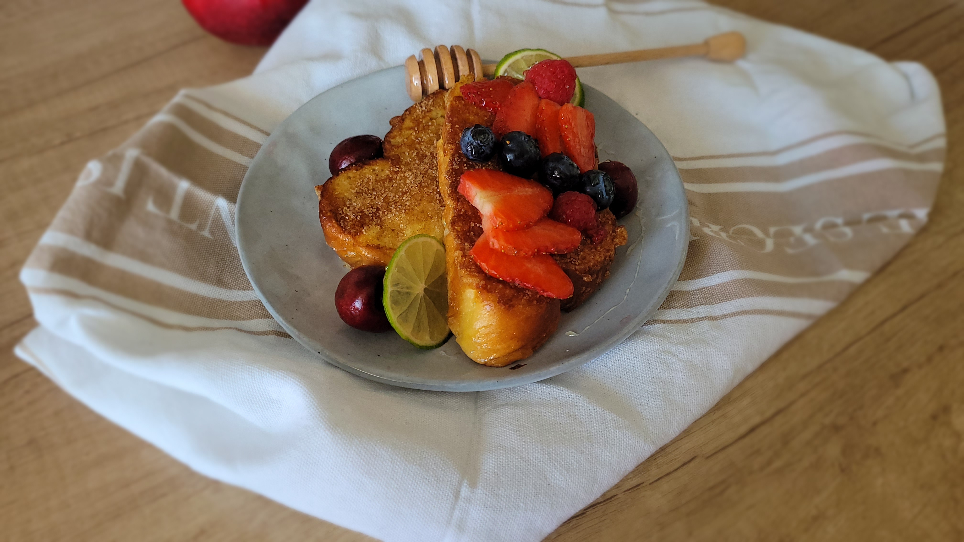 5. Ciepłe tosty posyp cynamonowym cukrem i ułóż na nich ulubione owoce. Całość można dodatkowo polać niewielką ilością miodu.