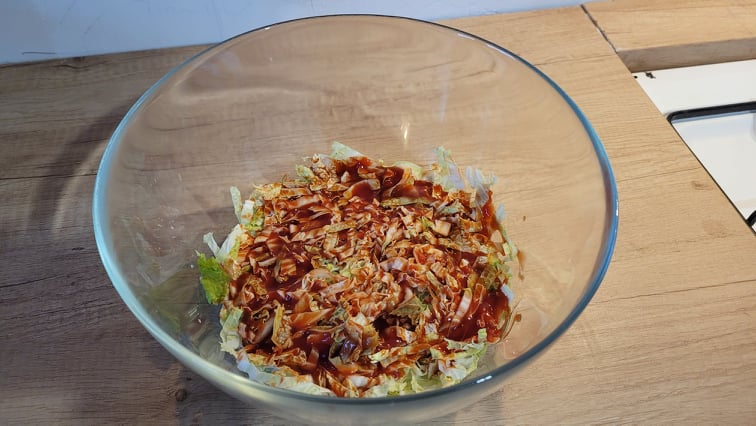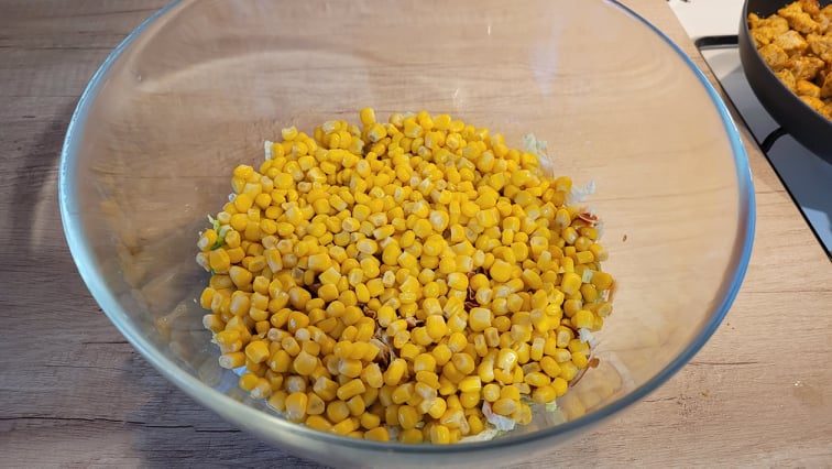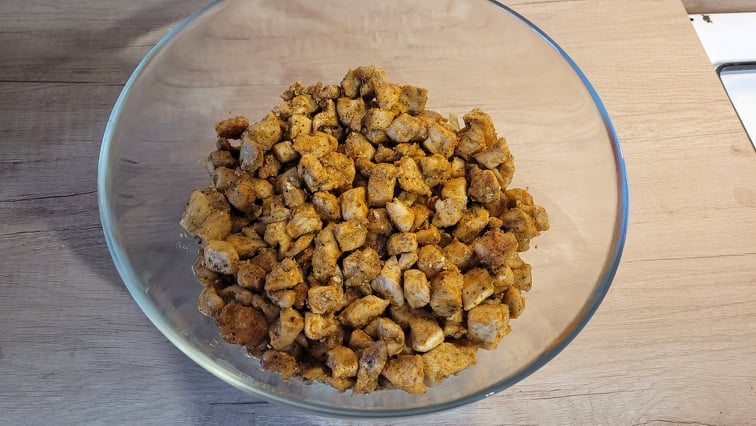 1. Piersi z kurczaka myjemy, osuszamy i oczyszczamy z błonek. Kroimy w drobną kostkę, dodajemy przyprawę i dokładnie mieszamy. Odstawiamy do lodówki na 15-20 minut.