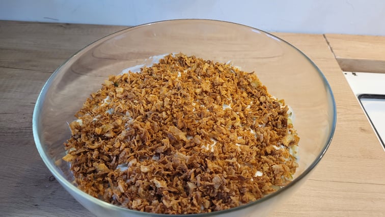 2. Na patelni rozgrzewamy olej, dodajemy kurczaka i smażymy, co jakiś czas mieszając. Odstawiamy do całkowitego wystudzenia.