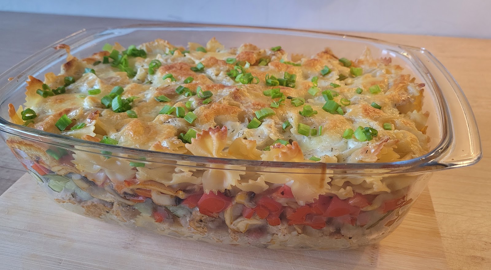 Składniki:- 500g makaronu kokardki- 500g fileta z piersi indyka lub kurczaka- 2 łyżki przyprawy gyros- 2 papryki czerwone- 500g pieczarek- 5-6 ogórków konserwowych- kulka sera mozzarella- olej do smażenia + do posmarowania dna naczynia żaroodpornego